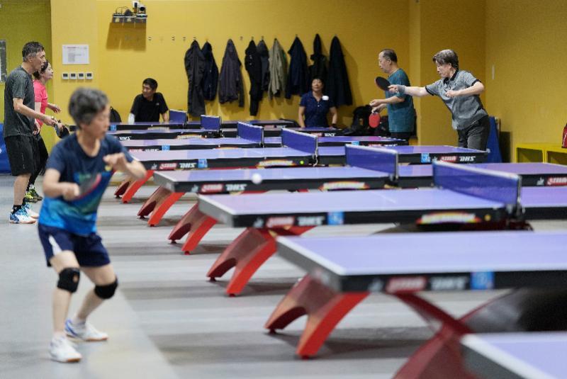 在北京回龙观体育文化公园体育健身中心的乒乓球馆内,居民打乒乓球锻炼。 新华社记者 鞠焕宗 摄